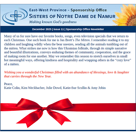 Our newsletter highlights stories, events, formation programs presented and general happenings throughout our sponsored ministries. This newsletter is distributed to all SNDdeN, members and directors of any East-West-sponsored ministry.